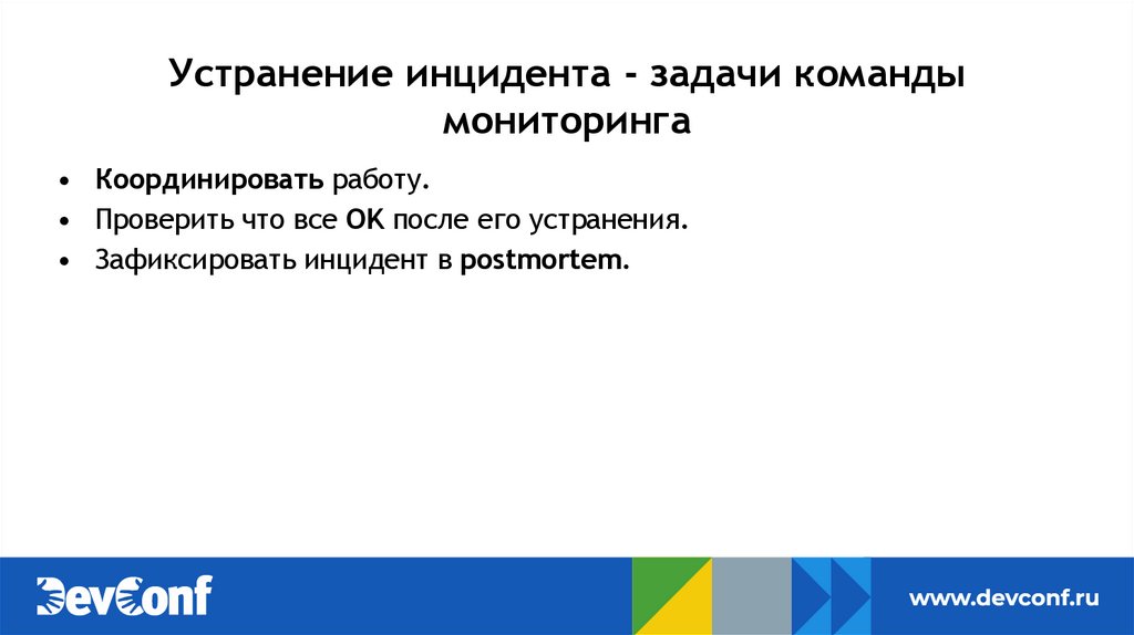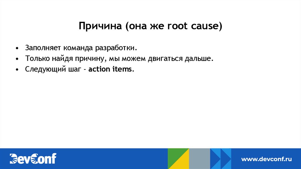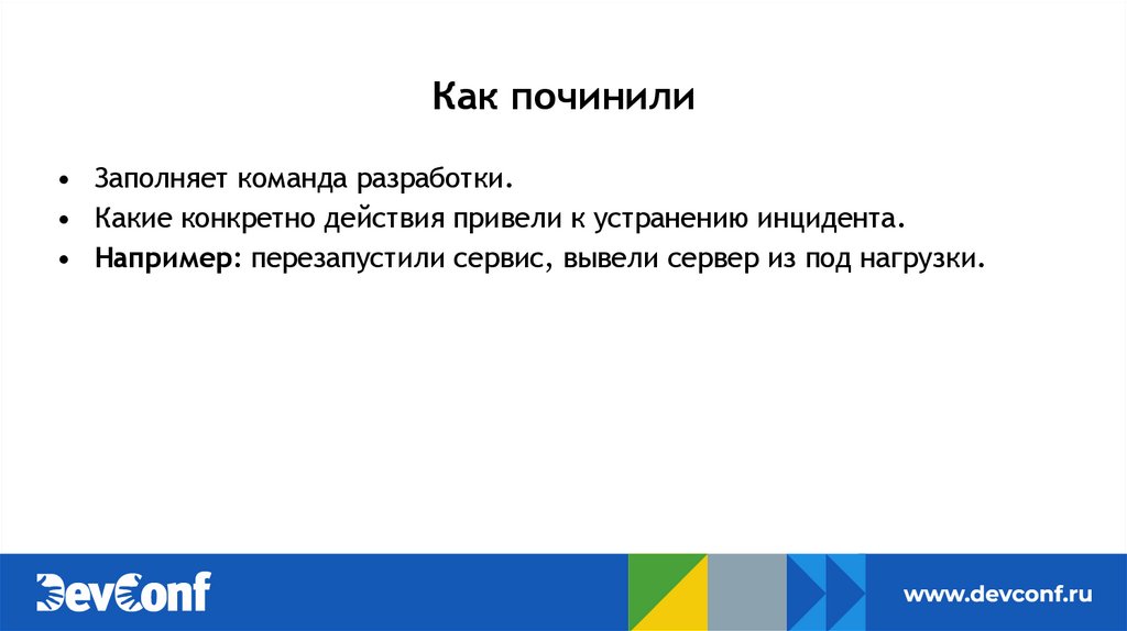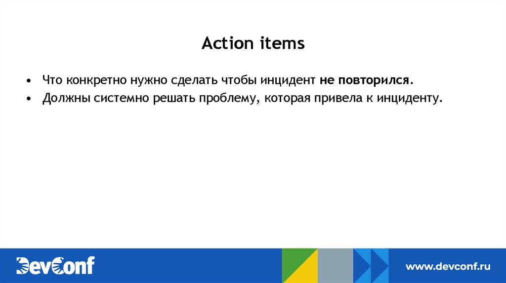 Action items• Что конкретно нужно сделать чтобы инцидент не повторился.