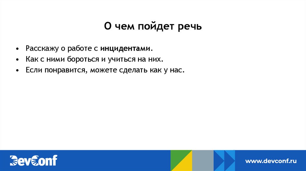 О чем пойдет речь• Расскажу о работе с инцидентами.