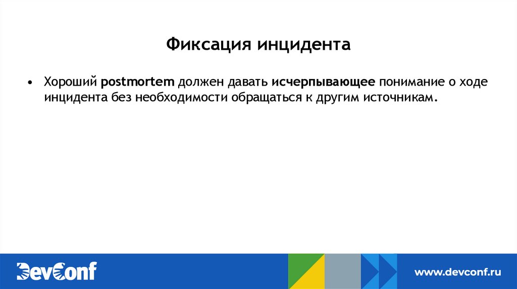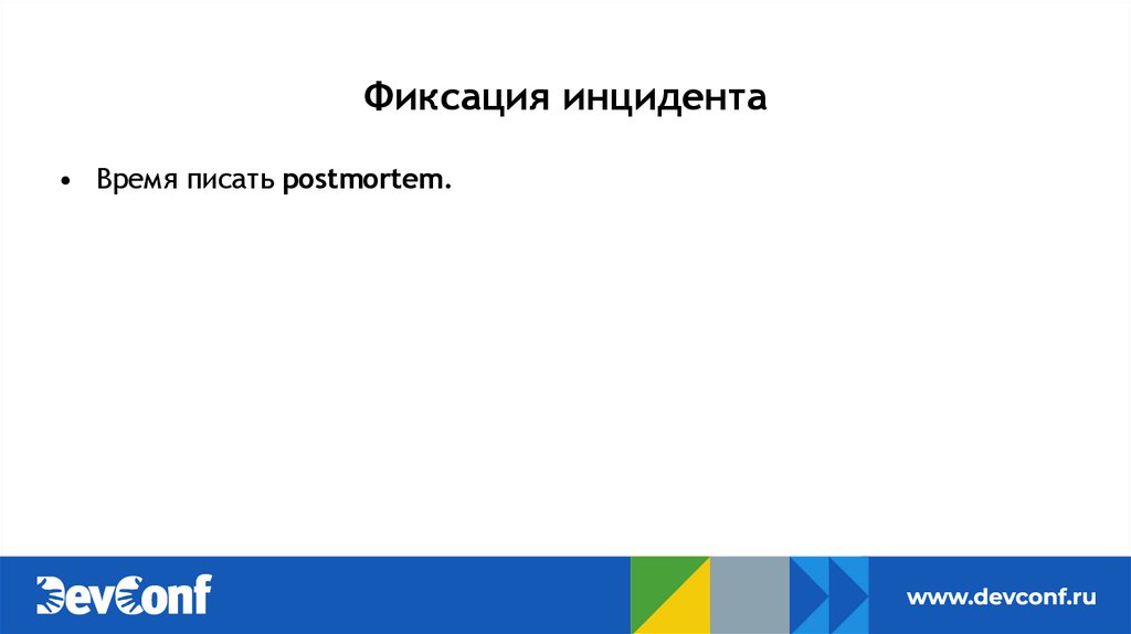 Фиксация инцидента• Хороший postmortem должен давать исчерпывающее понимание о ходе