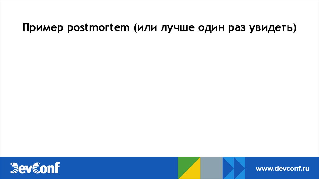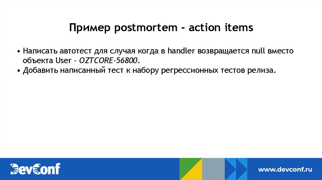 Пример postmortem - action items• Написать автотест для случая когда в handler возвращается null вместо