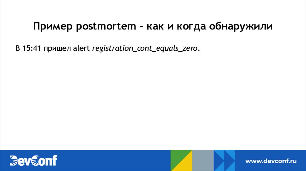 Пример postmortem - как и когда обнаружилиВ 15:41 пришел alert registration_cont_equals_zero.