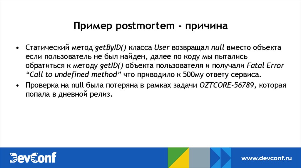Пример postmortem - причина• Статический метод getByID() класса User возвращал null вместо объекта