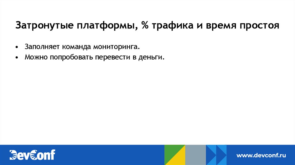 Затронутые платформы, % трафика и время простоя• Заполняет команда мониторинга.