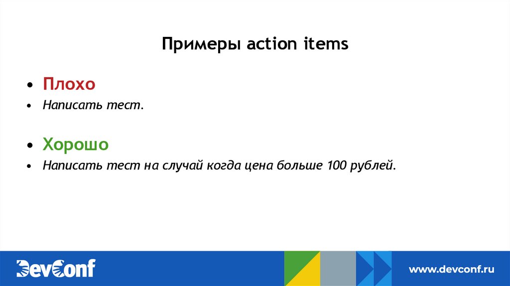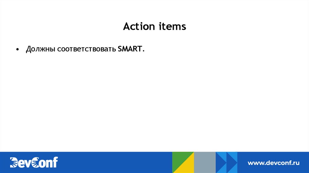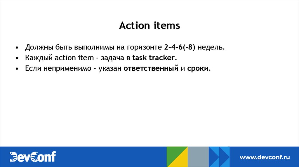 Action items• Должны быть выполнимы на горизонте 2-4-6(-8) недель.
