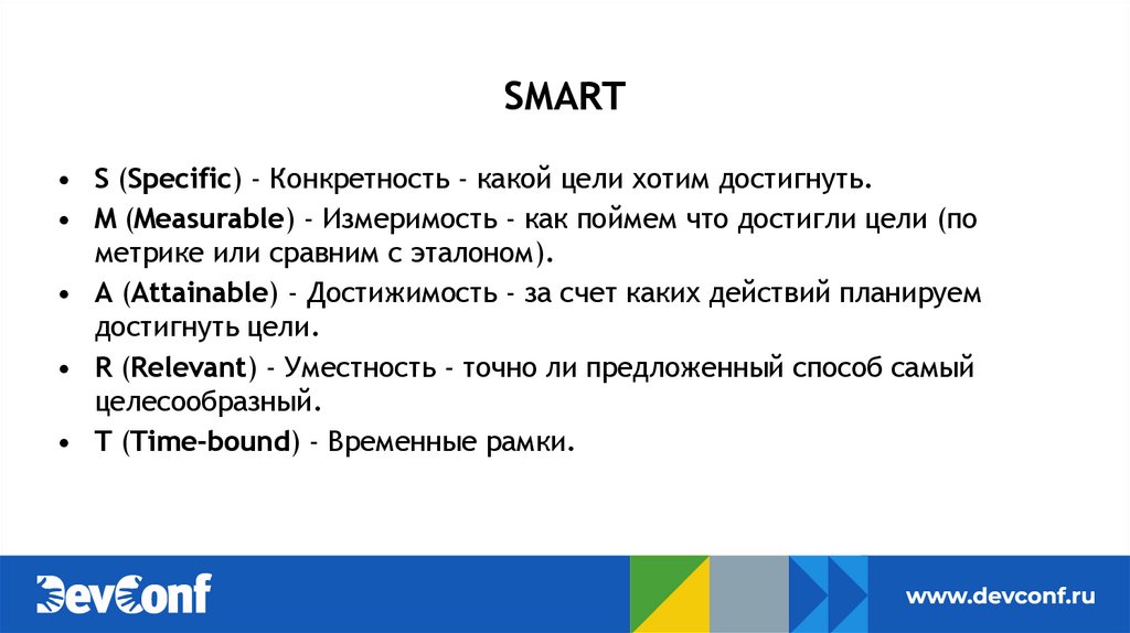 SMART• S (Specific) - Конкретность - какой цели хотим достигнуть.