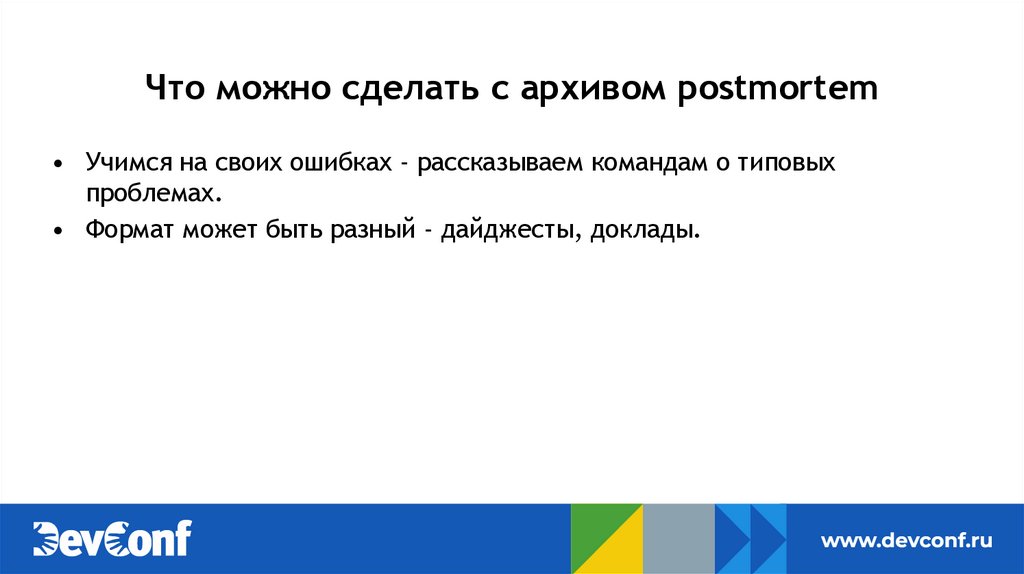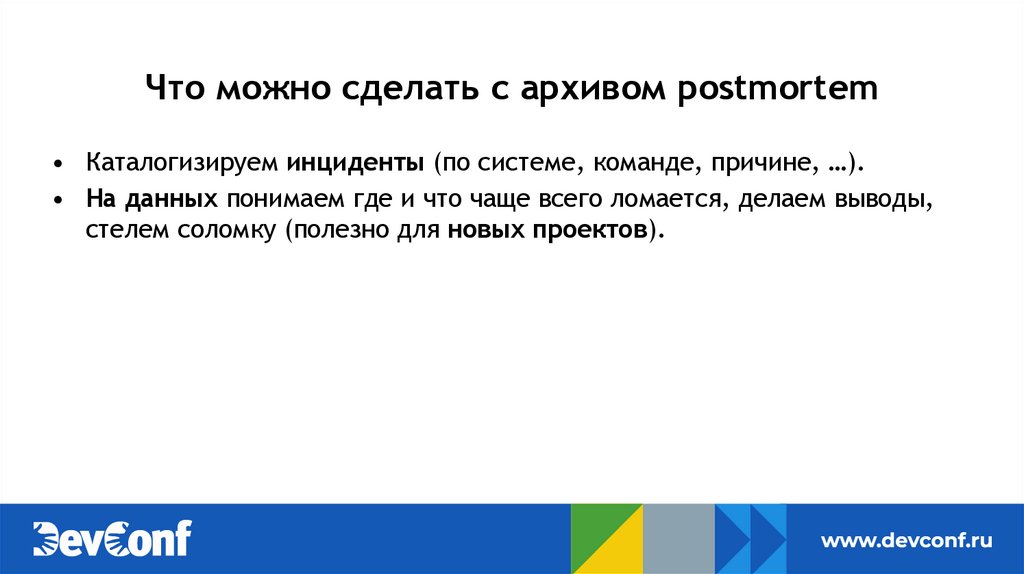 Что можно сделать с архивом postmortem• Учимся на своих ошибках - рассказываем командам о типовых
