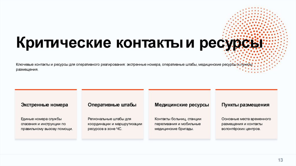 Критические контакты и ресурсыКлючевые контакты и ресурсы для оперативного реагирования: экстренные номера, оперативные штабы, медицинские ресурсы и пункты