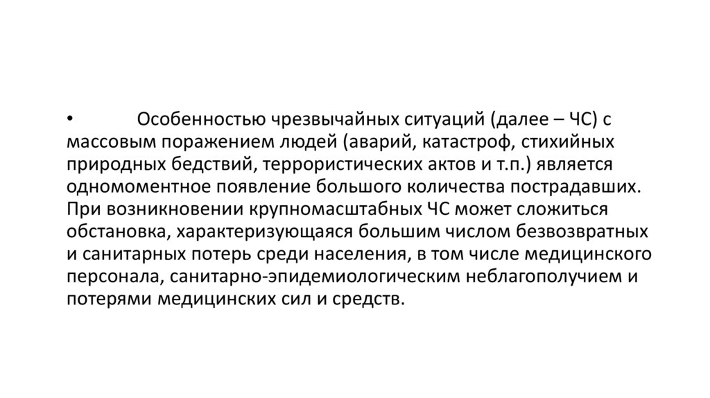 • Для ЧС мирного времени характерно следующее:• катастрофа происходит внезапно с формированием массовых санитарных потерь;