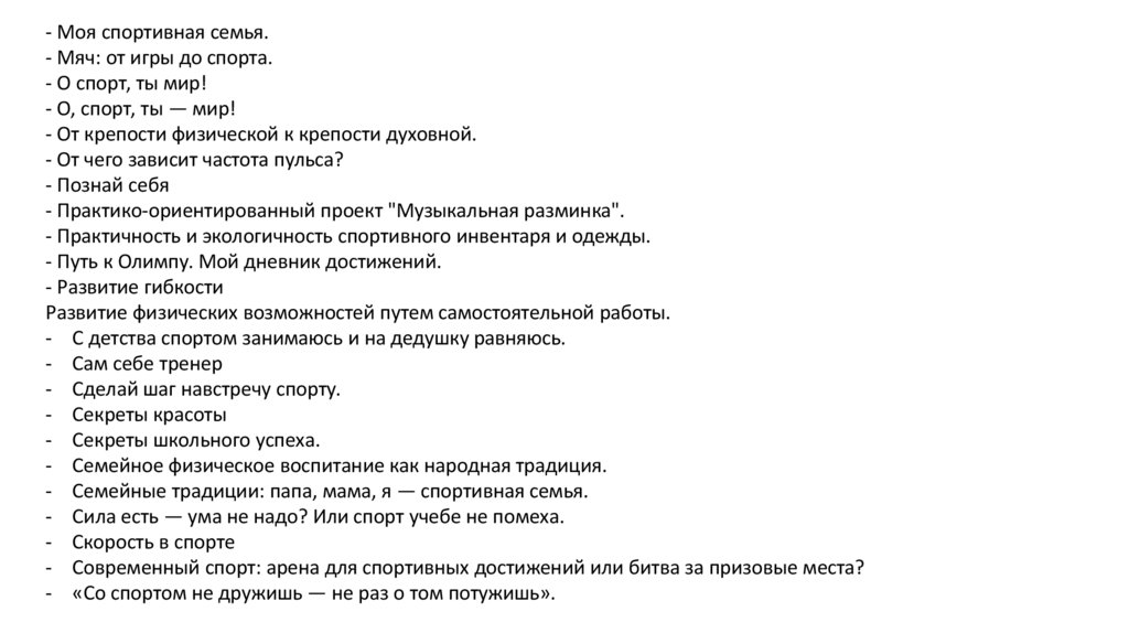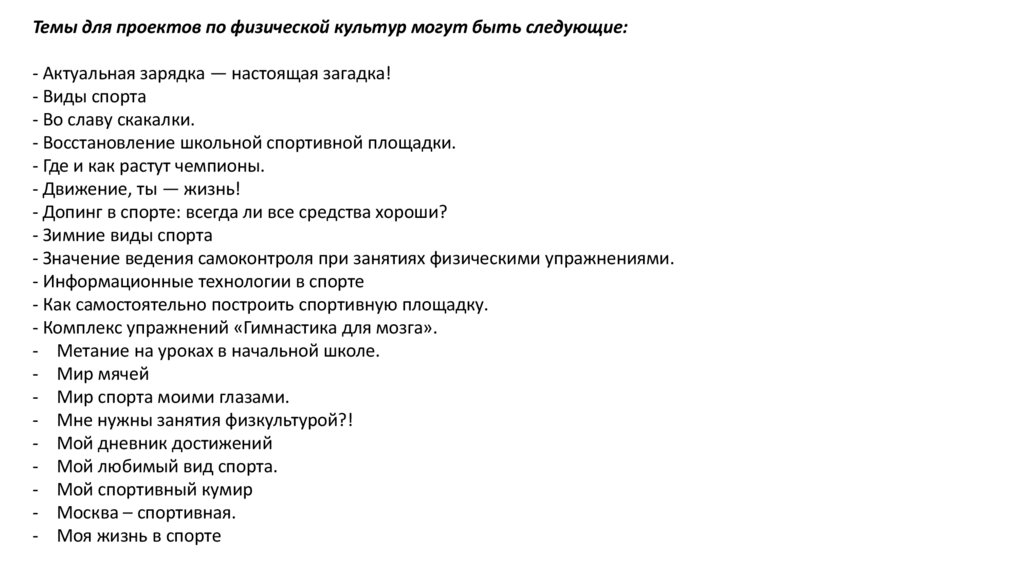 Темы для проектов по физической культур могут быть следующие:- Актуальная зарядка — настоящая загадка!
