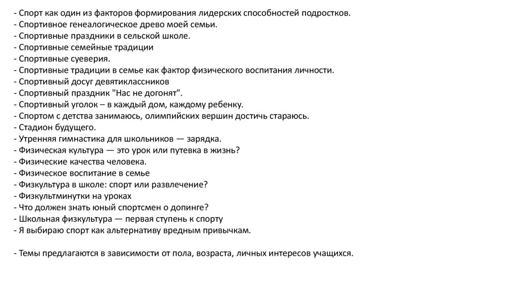 - Темы предлагаются в зависимости от пола, возраста, личных интересов учащихся.