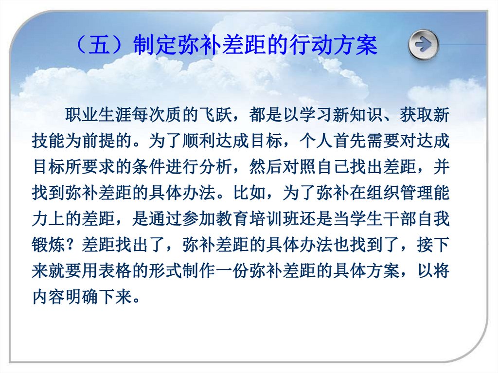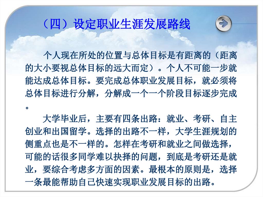 四 设定职业生涯发展路线个人现在所处的位置与总体目标是有距离的 距离