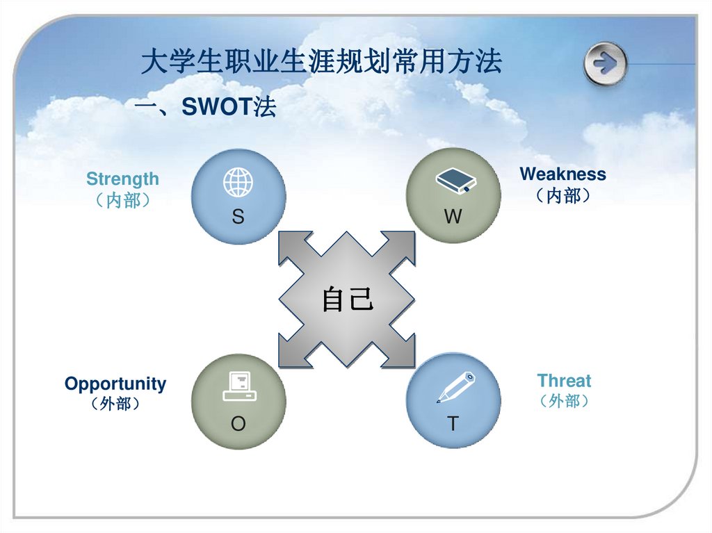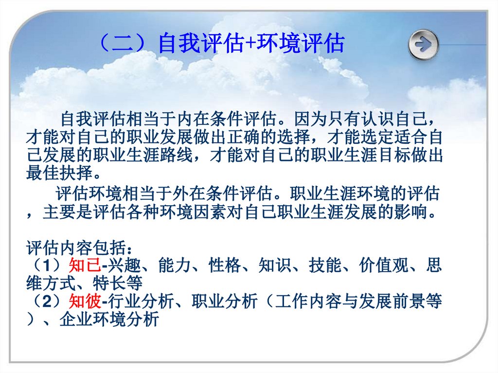 二 自我评估+环境评估自我评估相当于内在条件评估。因为只有认识自己