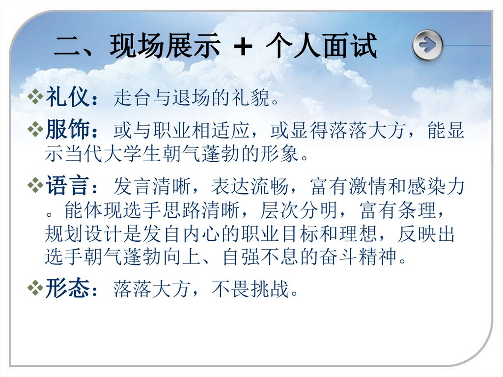 二、现场展示 + 个人面试礼仪 走台与退场的礼貌。