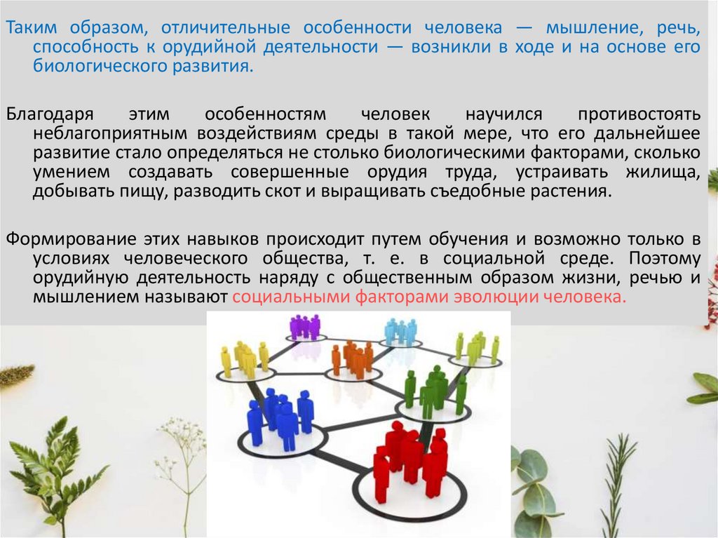Таким образом, отличительные особенности человека — мышление, речь,способность к орудийной деятельности — возникли в ходе и на основе его