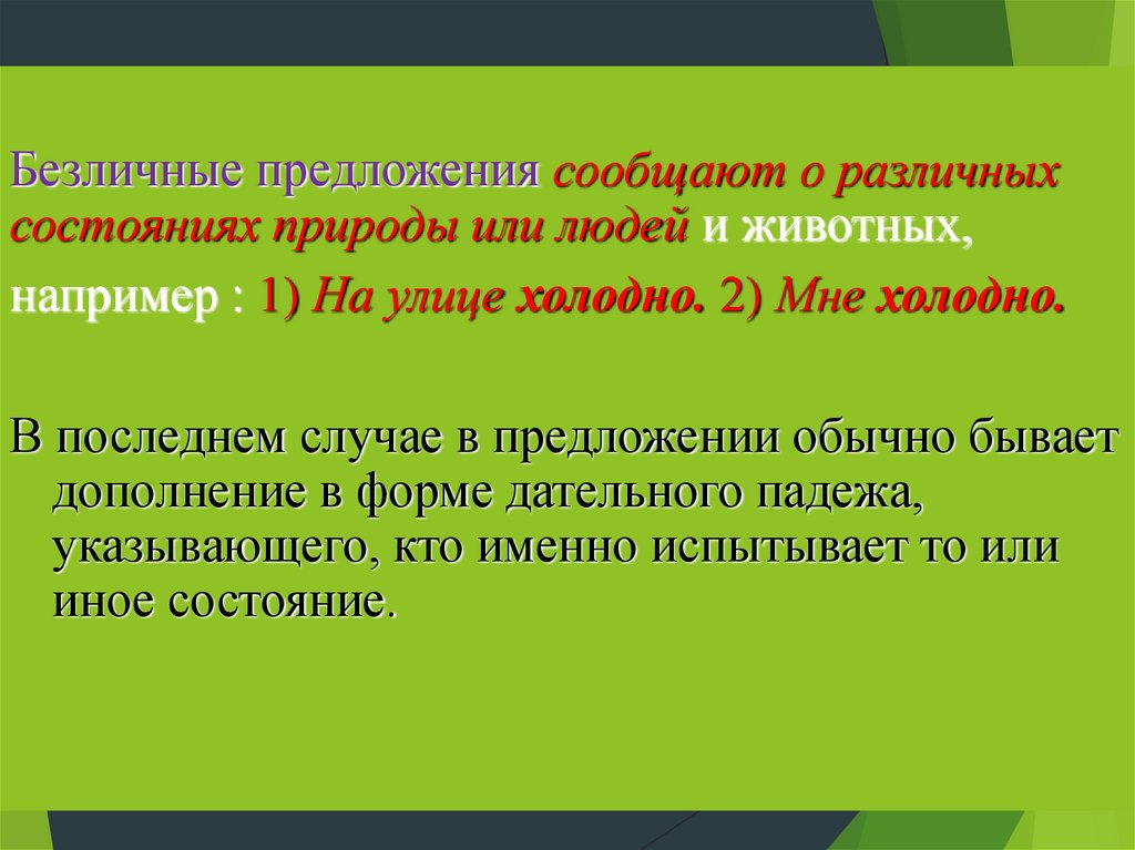 Безличные предложения сообщают о различныхсостояниях природы или людей и животных,