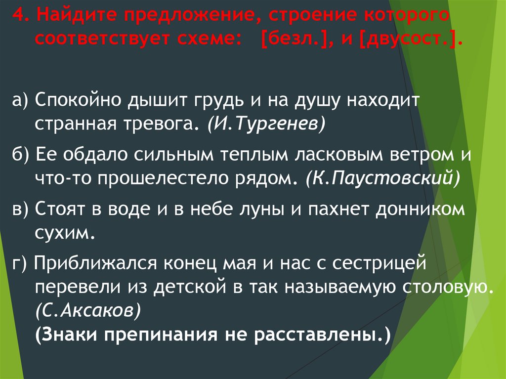 4. Найдите предложение, строение которогосоответствует схеме: [безл.], и [двусост.].