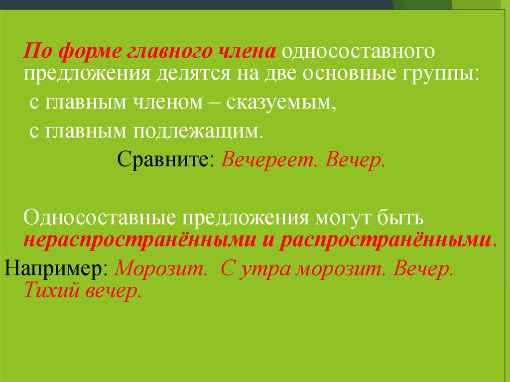 По форме главного члена односоставногопредложения делятся на две основные группы: