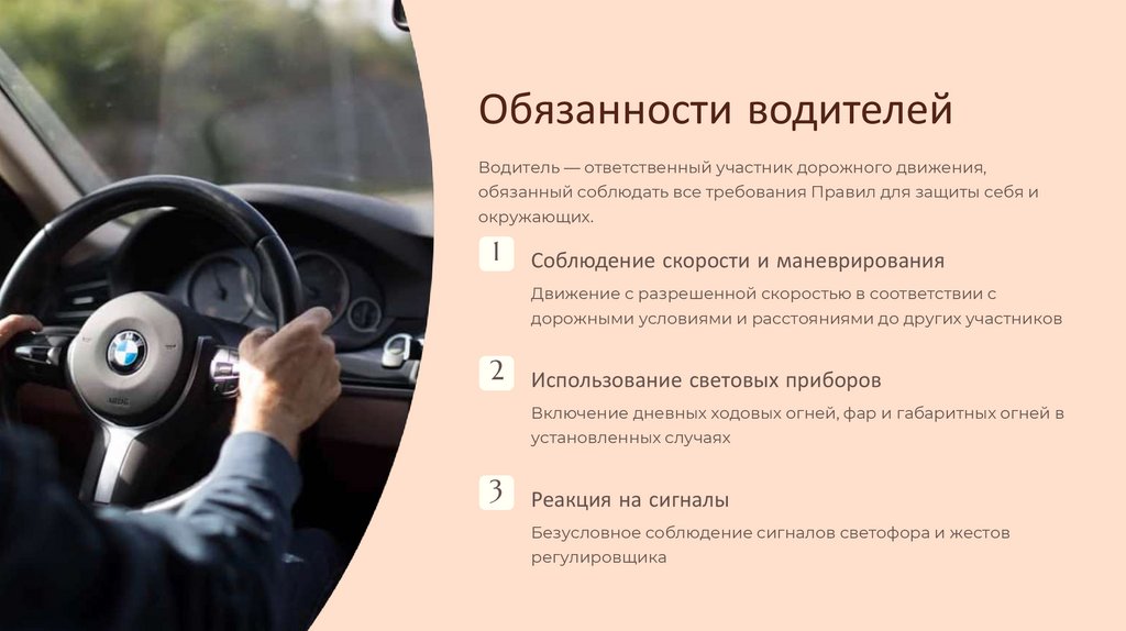 Обязанности водителейВодитель — ответственный участник дорожного движения,