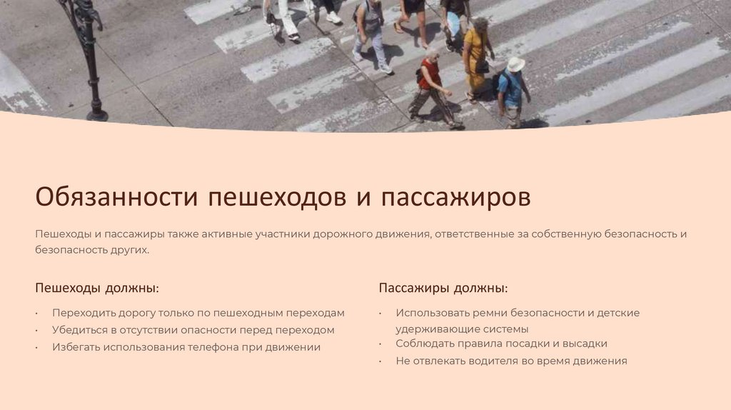 Обязанности пешеходов и пассажировПешеходы и пассажиры также активные участники дорожного движения, ответственные за собственную безопасность и