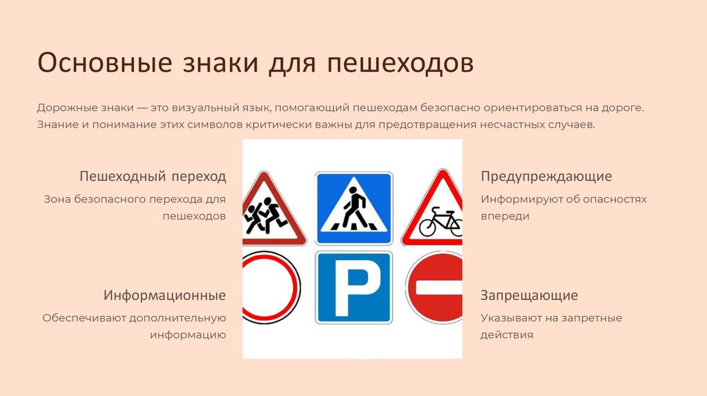 Основные знаки для пешеходовДорожные знаки — это визуальный язык, помогающий пешеходам безопасно ориентироваться на дороге.