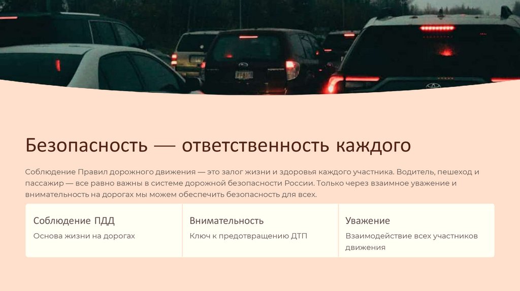 Безопасность — ответственность каждогоСоблюдение Правил дорожного движения — это залог жизни и здоровья каждого участника. Водитель, пешеход и