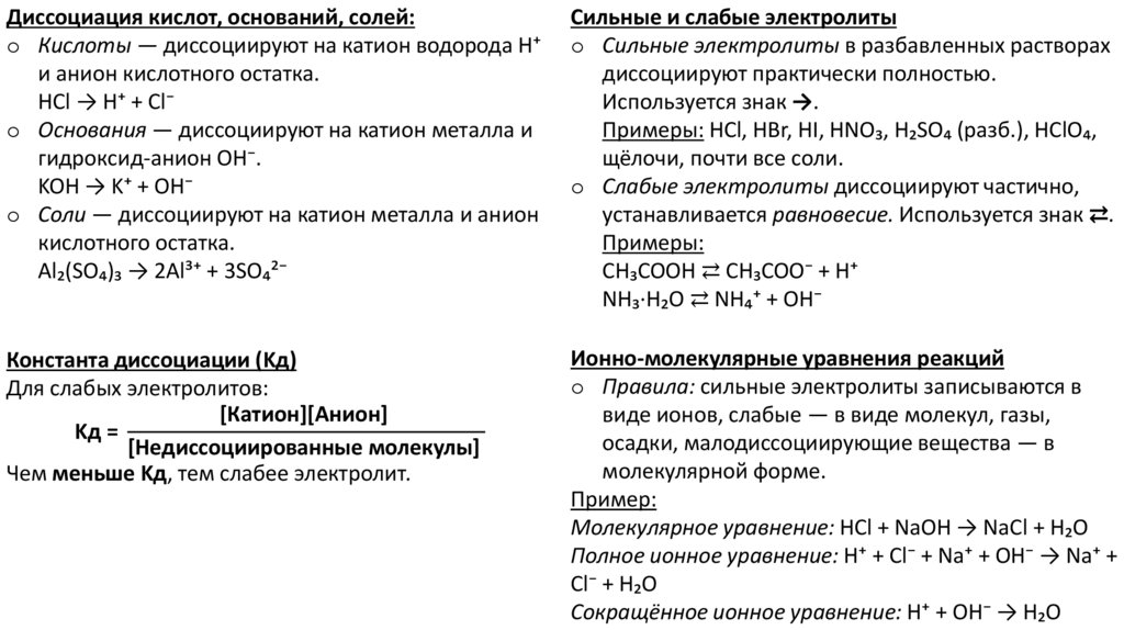Диссоциация кислот, оснований, солей:o Кислоты — диссоциируют на катион водорода H⁺