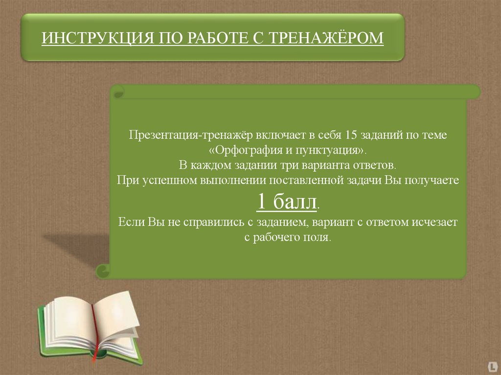 ИНСТРУКЦИЯ ПО РАБОТЕ С ТРЕНАЖЁРОМПрезентация-тренажёр включает в себя 15 заданий по теме