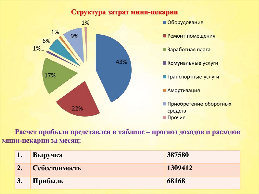 Прибыль по итогам месяца работы предприятиясоставит 68168 рублей. Рентабельность минипекарни при таких показателях составляет 24%.
