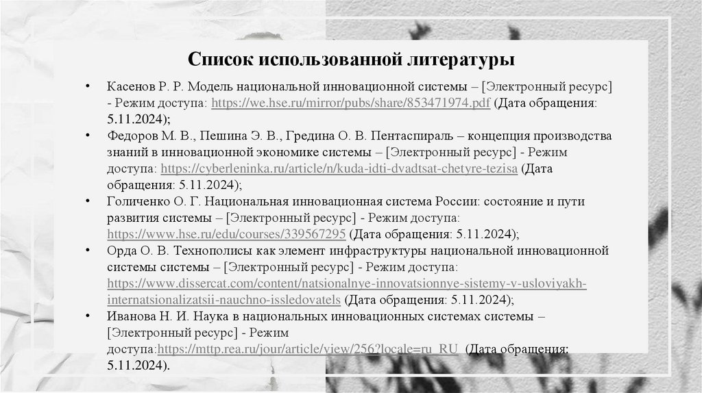 Список использованной литературыКасенов Р. Р. Модель национальной инновационной системы – [Электронный ресурс]