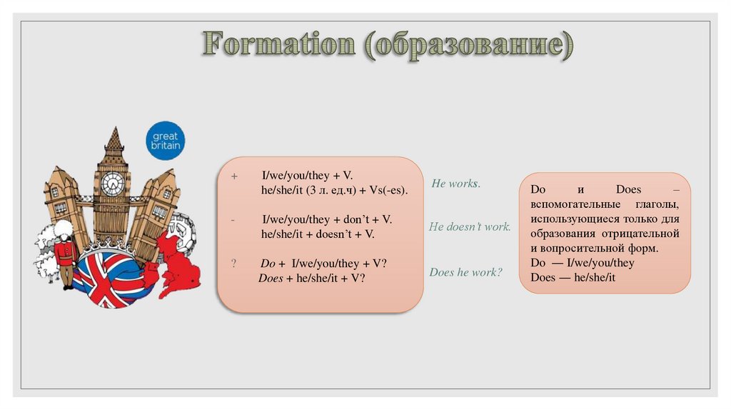 he/she/it (3 л. ед.ч) + Vs(-es).