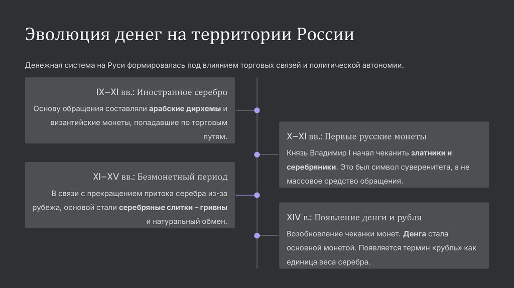 Эволюция денег на территории РоссииДенежная система на Руси формировалась под влиянием торговых связей и политической автономии.