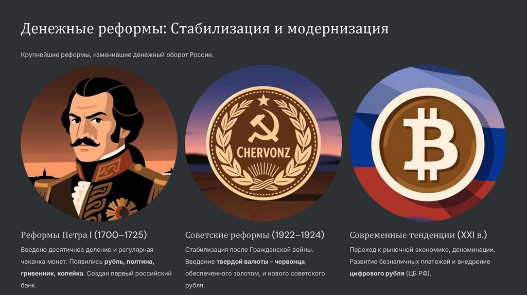 Денежные реформы: Стабилизация и модернизацияКрупнейшие реформы, изменившие денежный оборот России.