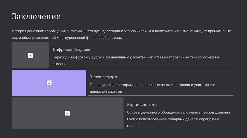 ЗаключениеИстория денежного обращения в России — это путь адаптации к экономическим и политическим изменениям, от примитивных
