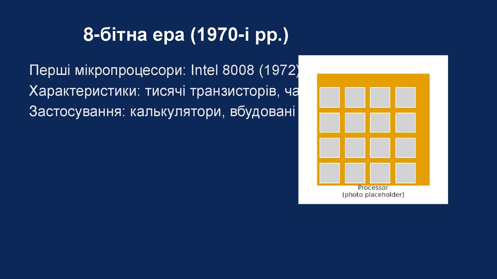 8-бітна ера (1970-і рр.)Перші мікропроцесори: Intel 8008 (1972), Zilog Z80 (1976)