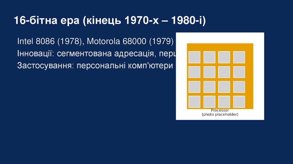 16-бітна ера (кінець 1970-х – 1980-і)Intel 8086 (1978), Motorola 68000 (1979)