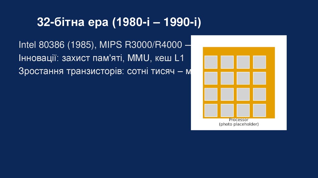 32-бітна ера (1980-і – 1990-і)Intel 80386 (1985), MIPS R3000/R4000 — RISC розвиток