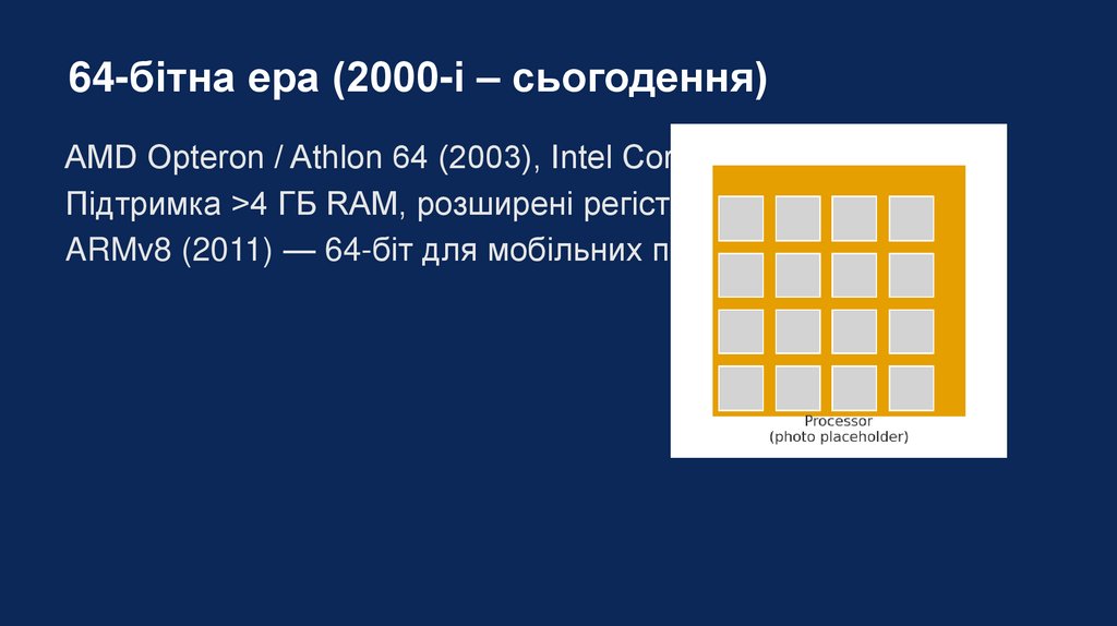 64-бітна ера (2000-і – сьогодення)AMD Opteron / Athlon 64 (2003), Intel Core (від 2006)