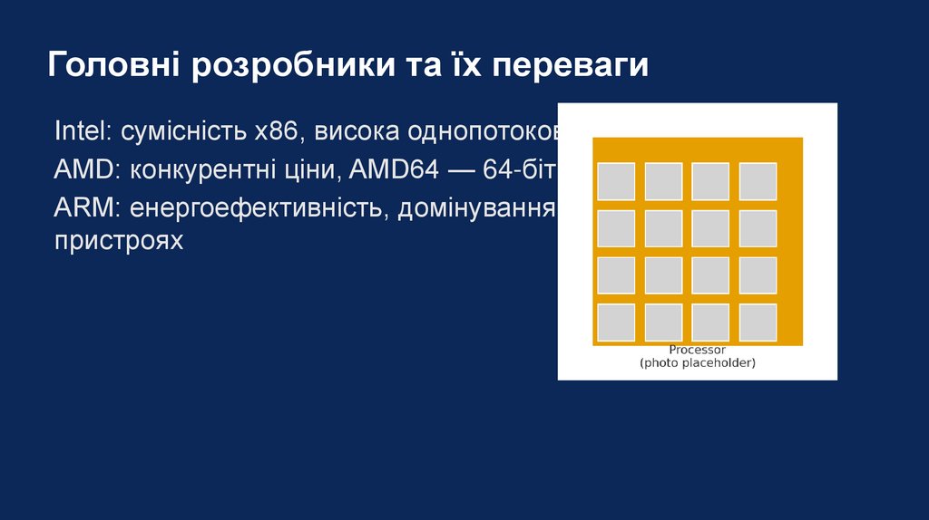 Головні розробники та їх перевагиIntel: сумісність x86, висока однопотокова продуктивність