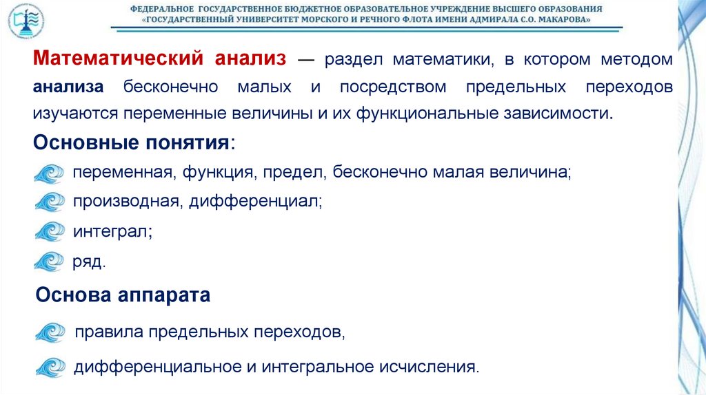Математический анализ ― раздел математики, в котором методоманализа бесконечно малых и посредством предельных переходов