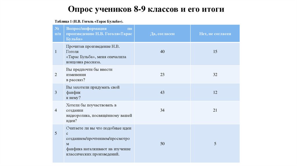 Опрос учеников 8-9 классов и его итогиТаблица 1 (Н.В. Гоголь «Тарас Бульба»).