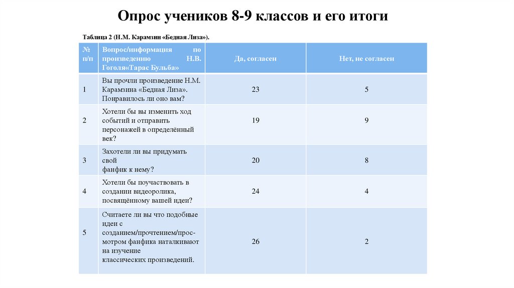 Опрос учеников 8-9 классов и его итогиТаблица 2 (Н.М. Карамзин «Бедная Лиза»).