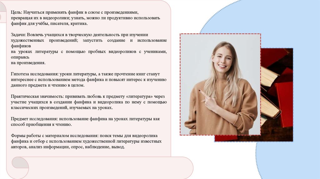 Цель: Научиться применять фанфик в союзе с произведениями,превращая их в видеоролики; узнать, можно ли продуктивно использовать
