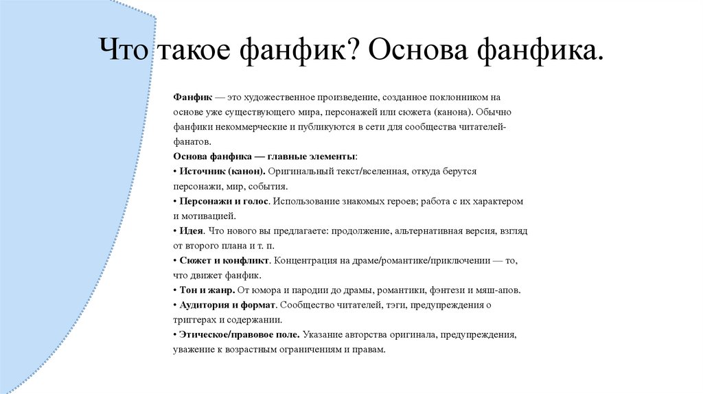 Что такое фанфик? Основа фанфика.Фанфик — это художественное произведение, созданное поклонником на