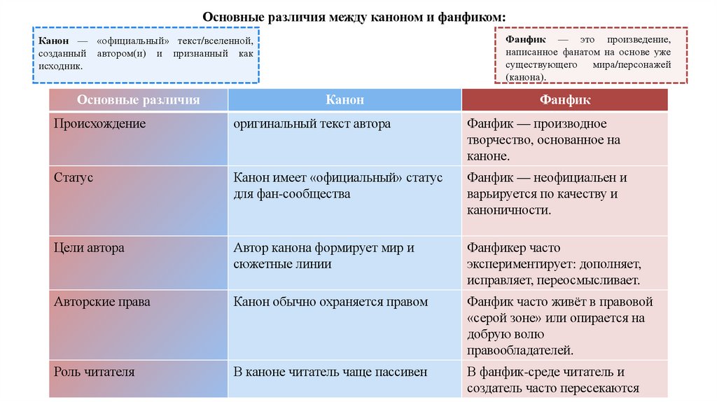 Основные различия между каноном и фанфиком:Фанфик — это произведение,