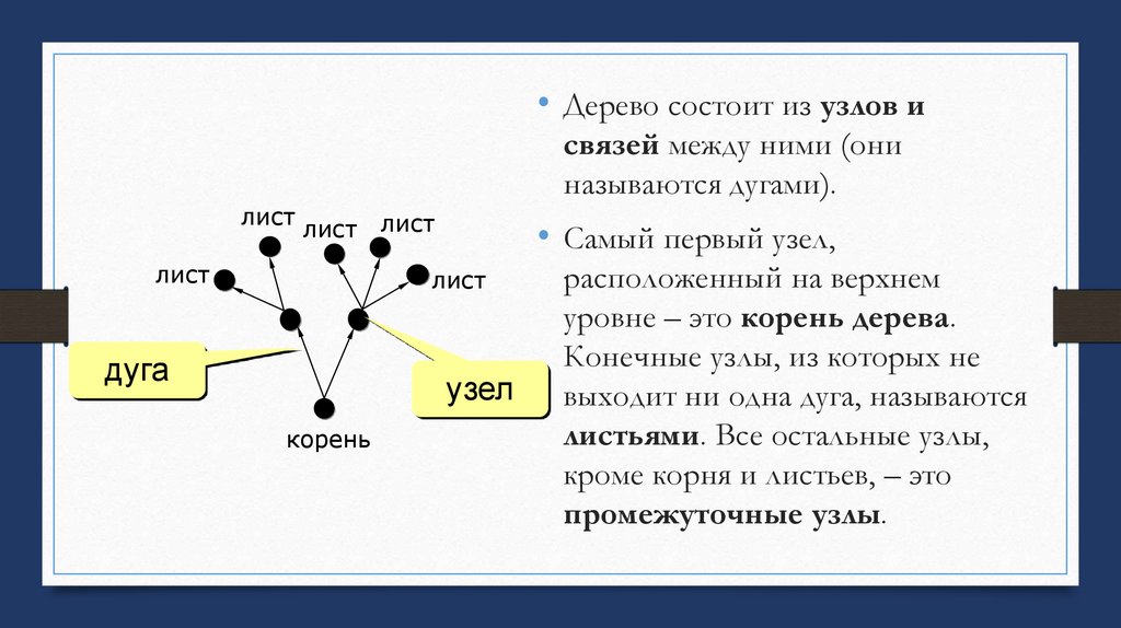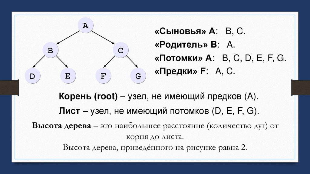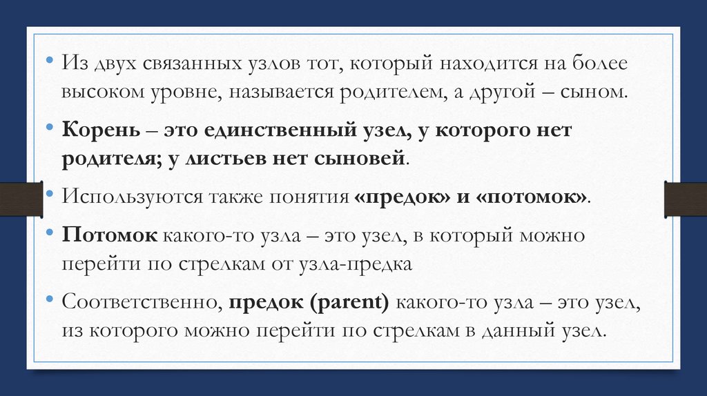 • Соответственно, предок (parent) какого-то узла – это узел,