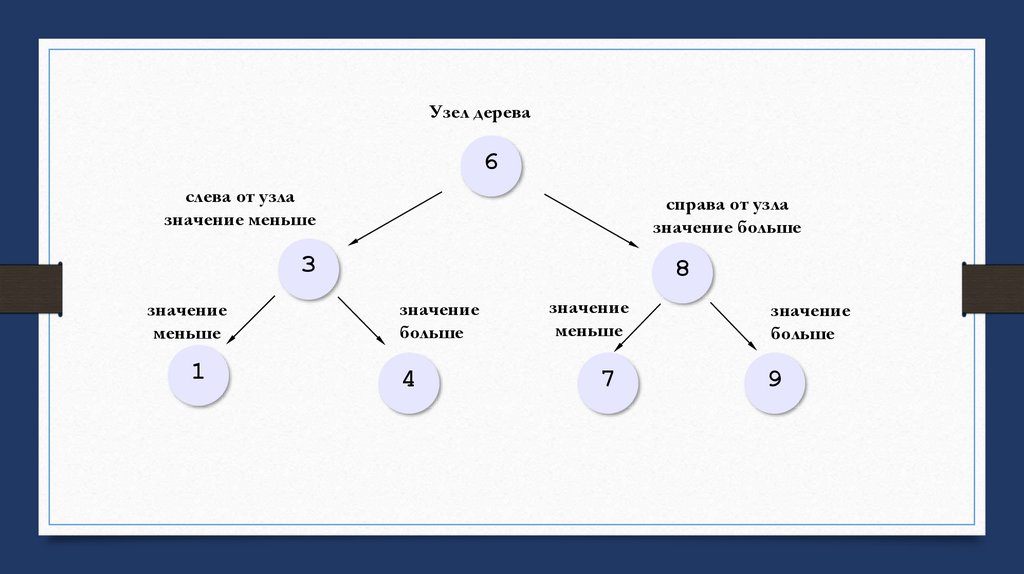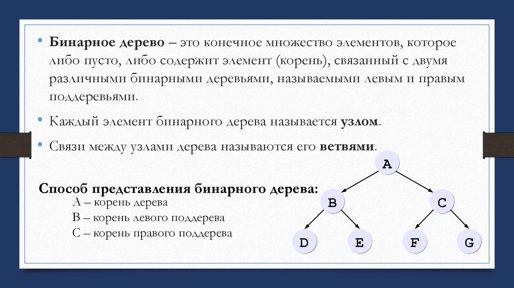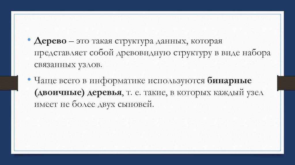 • Из двух связанных узлов тот, который находится на болеевысоком уровне, называется родителем, а другой – сыном.