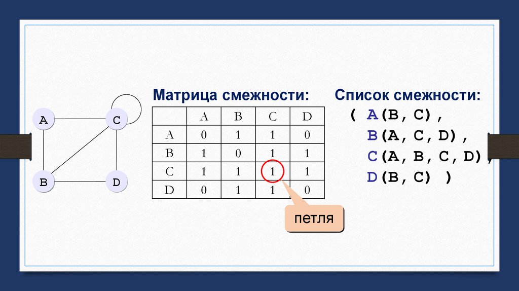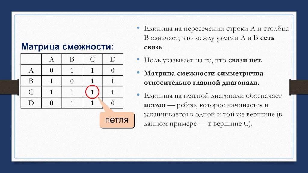 • Единица на пересечении строки А и столбцаМатрица смежности: