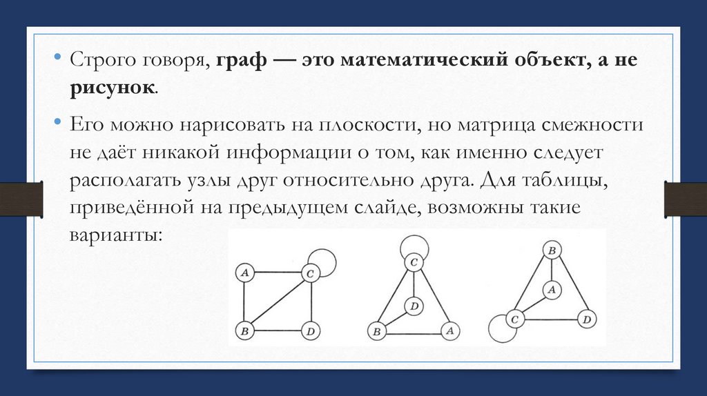 • Строго говоря, граф — это математический объект, а нерисунок.