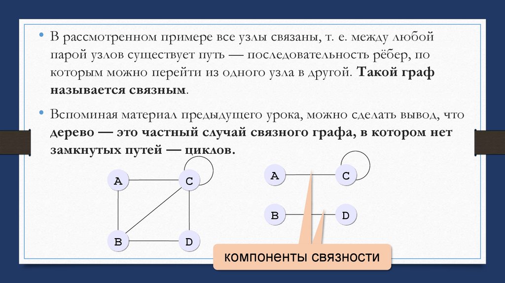 • В рассмотренном примере все узлы связаны, т. е. между любойпарой узлов существует путь — последовательность рёбер, по