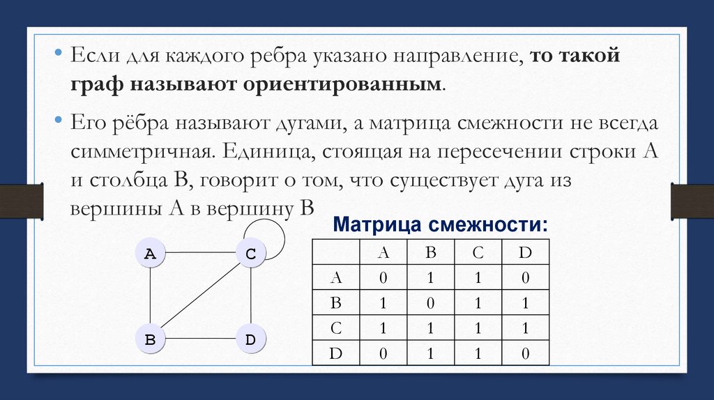 • Его рёбра называют дугами, а матрица смежности не всегда
